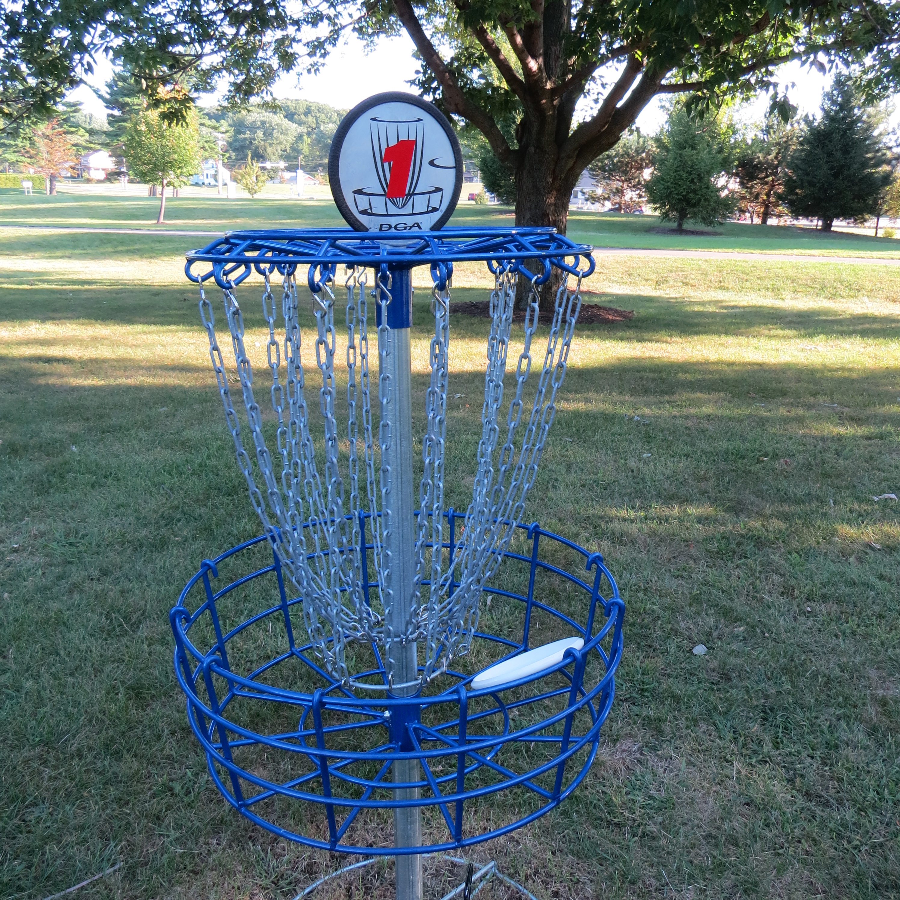 Though the graphics for the tee markers are still under production, all of the targets/baskets are set and the tee markers (plain white signs) are in place.